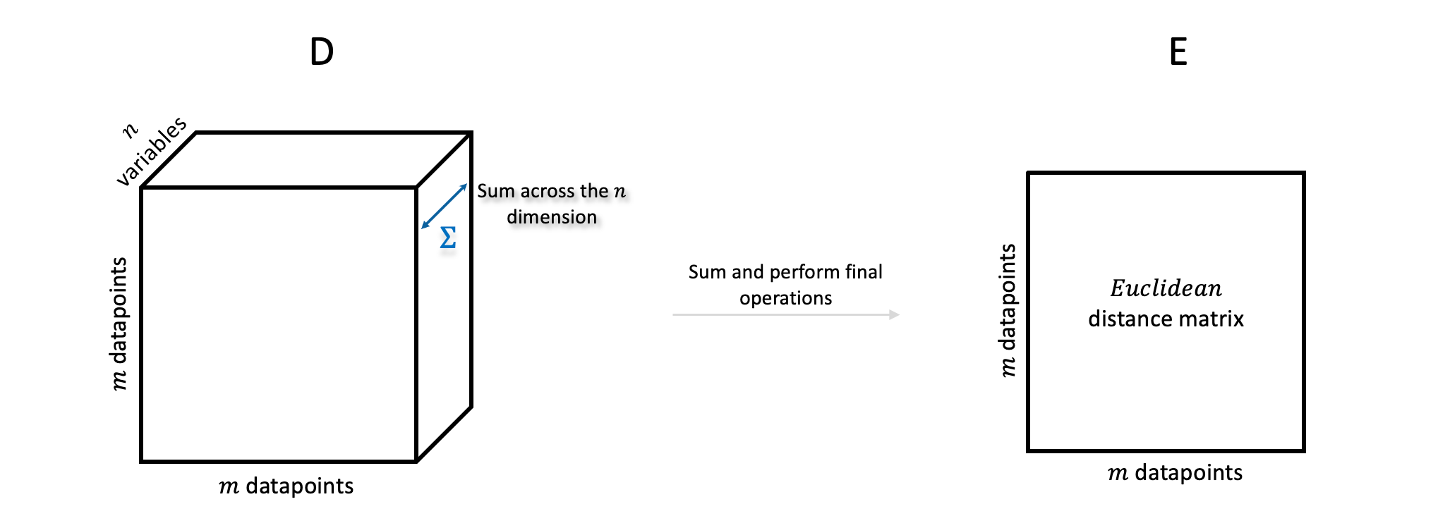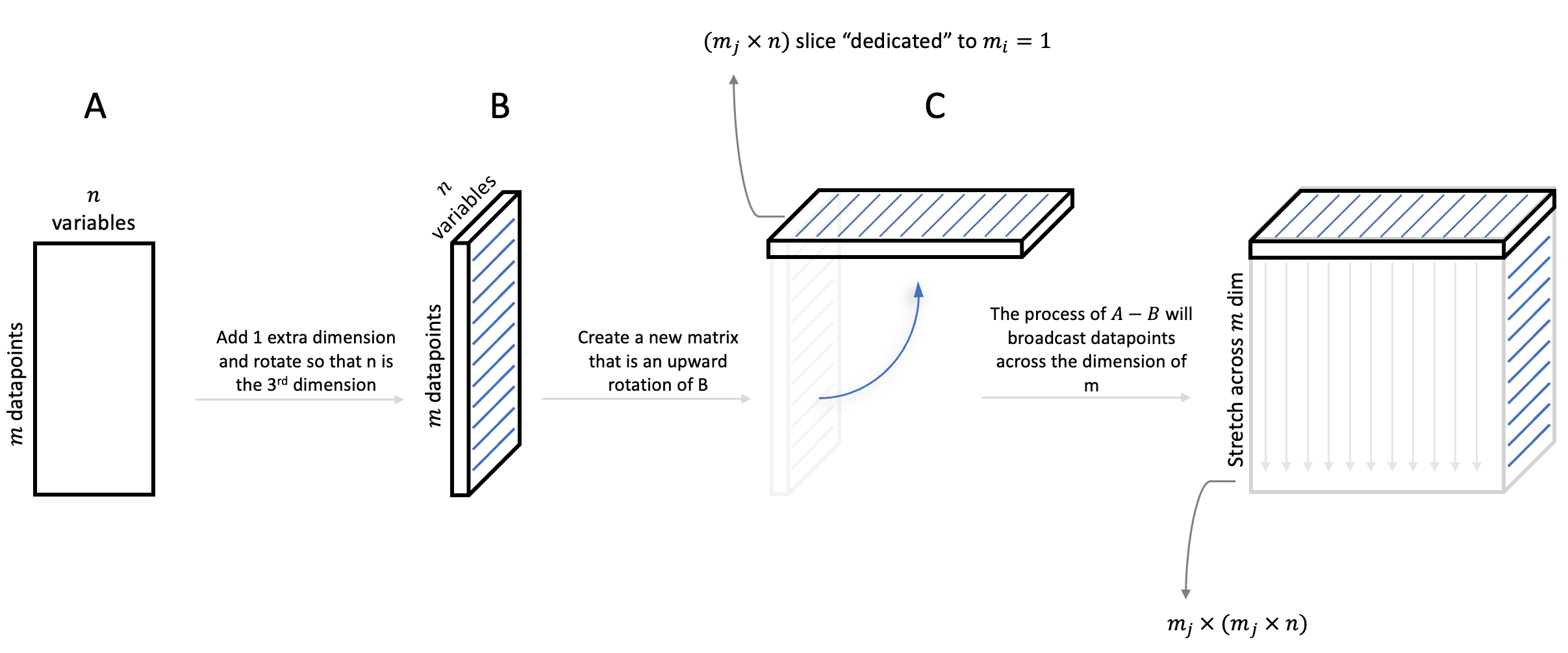 Generate a D=(mi×(m×n)) matrix where (m_jb × n) represents a slice “that belongs” to datapoint m_i and includes all other datapoints. Subtracting m_i from “their” slice will result in a slice consisting of all subtraction operations of m_i with every other m_j datapoint across all variables. To do the above we will